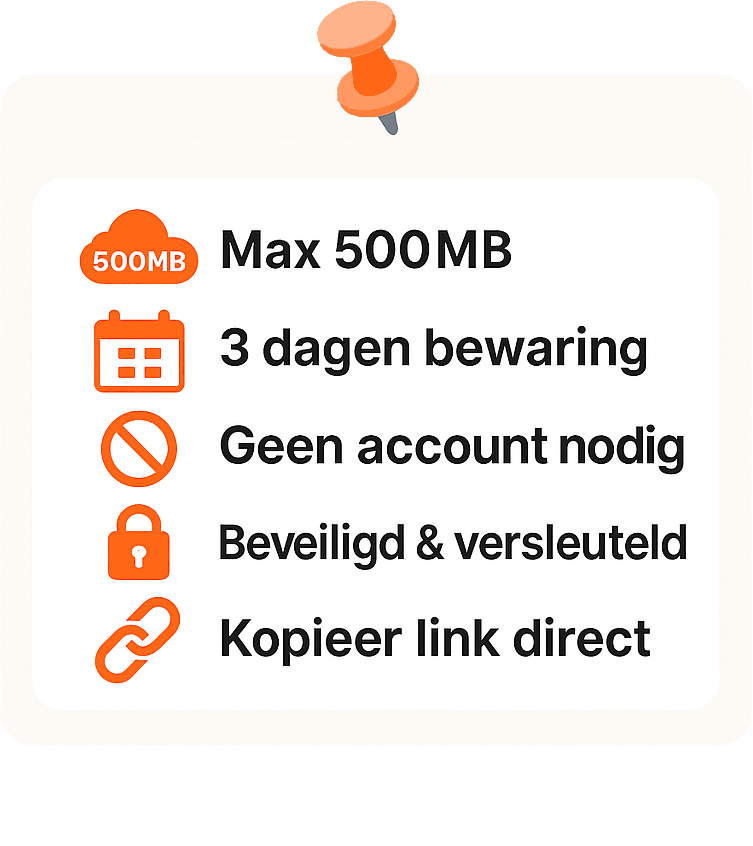 Deel documenten, afbeeldingen en video’s tot 500 MB snel en betrouwbaar. Perfect voor dagelijks gebruik.